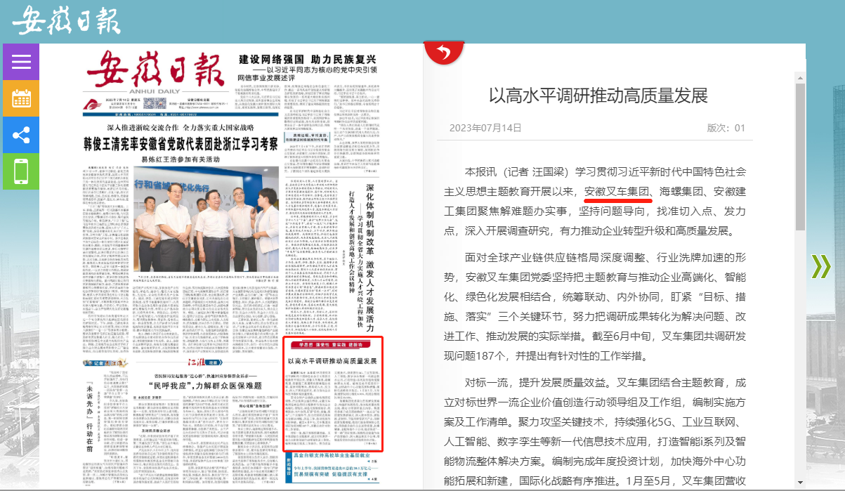 《安徽日報》報道安徽叉車集團以高水平調研推動高質量發展情況