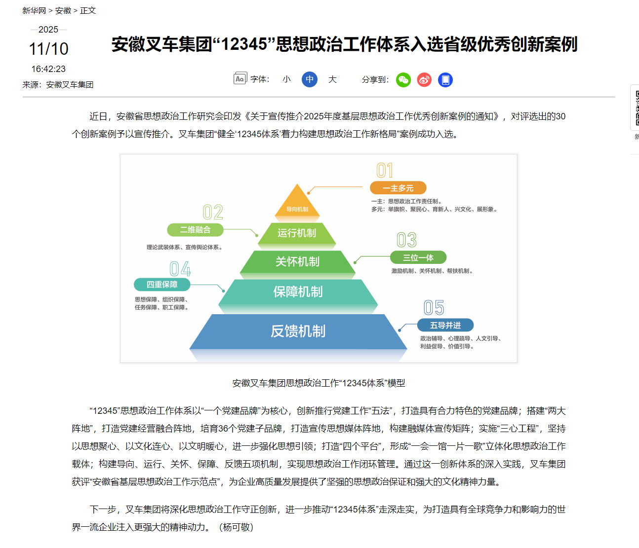 近日,安徽省思想政治工作研究會印發(fā)《關(guān)于宣傳推介2025年度基層思想政治工作優(yōu)秀創(chuàng)新案例的通知》,對評選出的30個(gè)創(chuàng)新案例予以宣傳推介。叉車集團(tuán)“健全‘12345體系’著力構(gòu)建思想政治工作新格局”案例成功入選。 “12345”思想政治工作體系以“一個(gè)黨建...